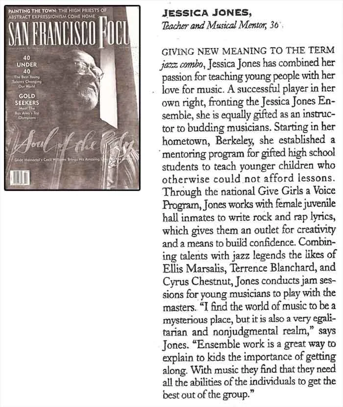 The Jessica Jones Quartet is committed to community outreach and education. Jessica and Tony Jones organize events, workshops and community programs through their non profit platform Rare Earth Vibration Association.